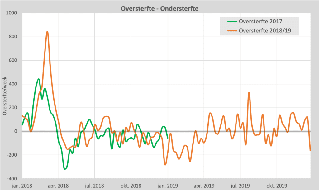 De oranje lijn is de oversterfte van de griepepidemie van 2018, doorlopend in 2019 en de groene die van 2017, geprojecteerd over die van 2018.